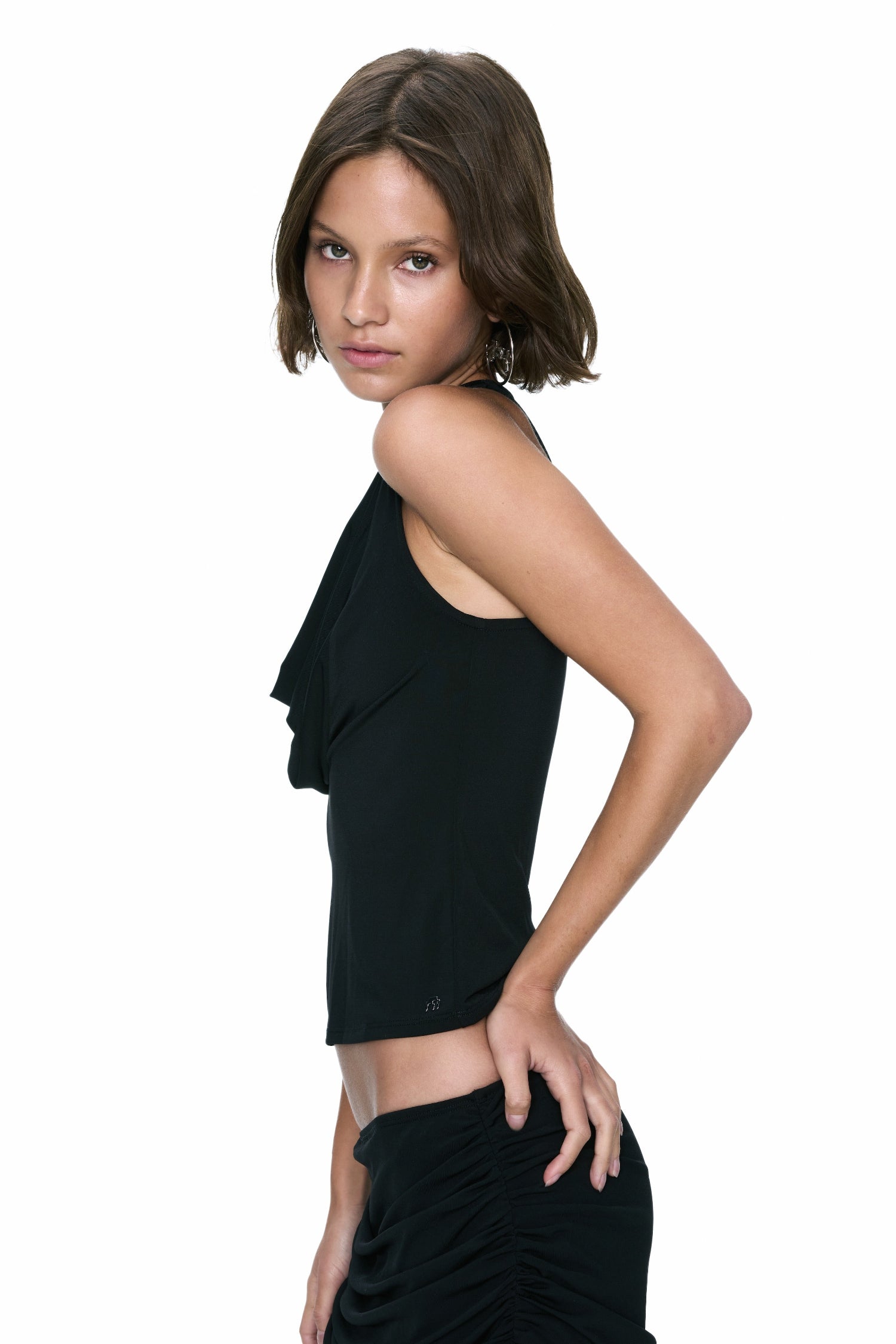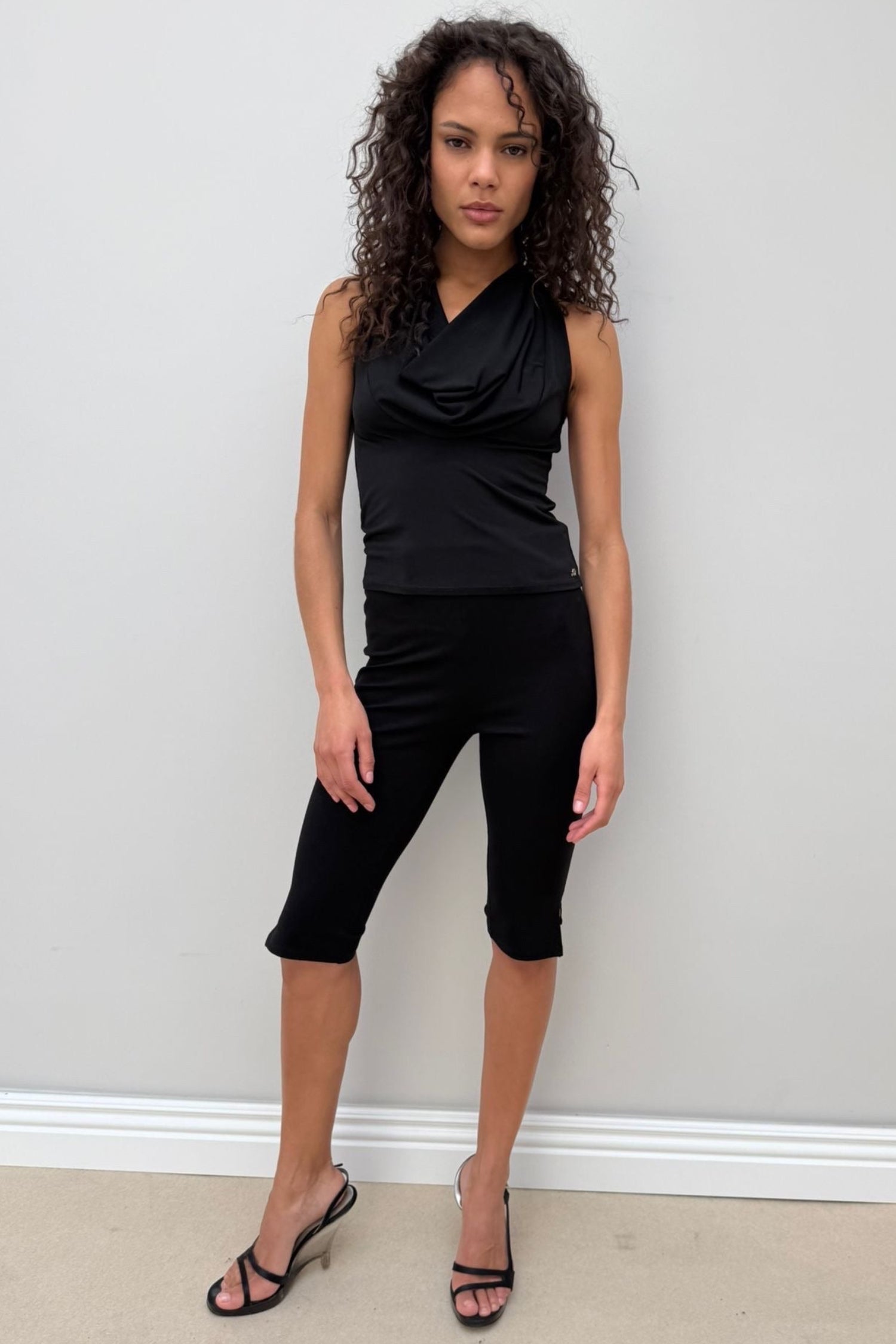 The Renee Top features a draped cowl neckline and a racerback with smooth, body-skimming stretch fabric. Refined and effortless, she was made for after-dark styling.