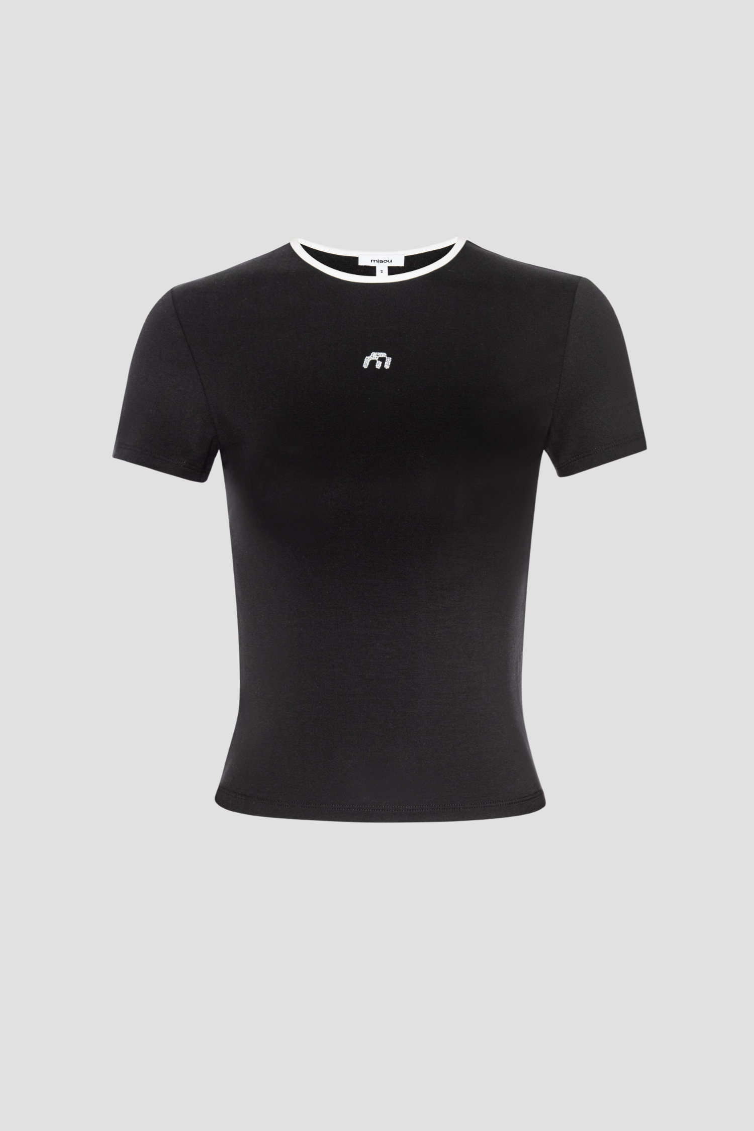 The Mini Tee is back in black, featuring a Miaou logo made out of the tiniest rhinestones. She has a white contrast neckline. Pair with one of our Zebra capsule pieces to fulfill your black and white fantasy.
