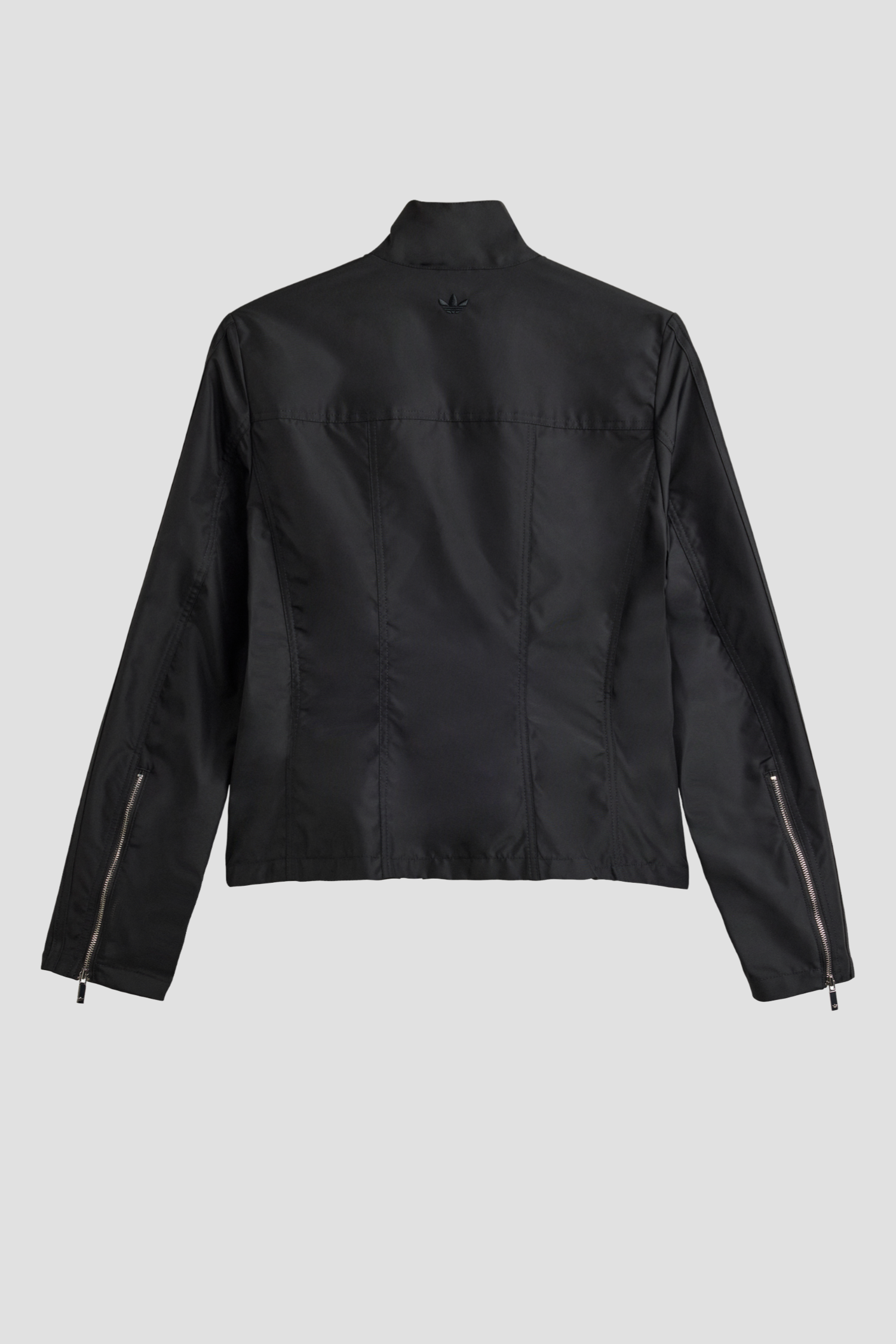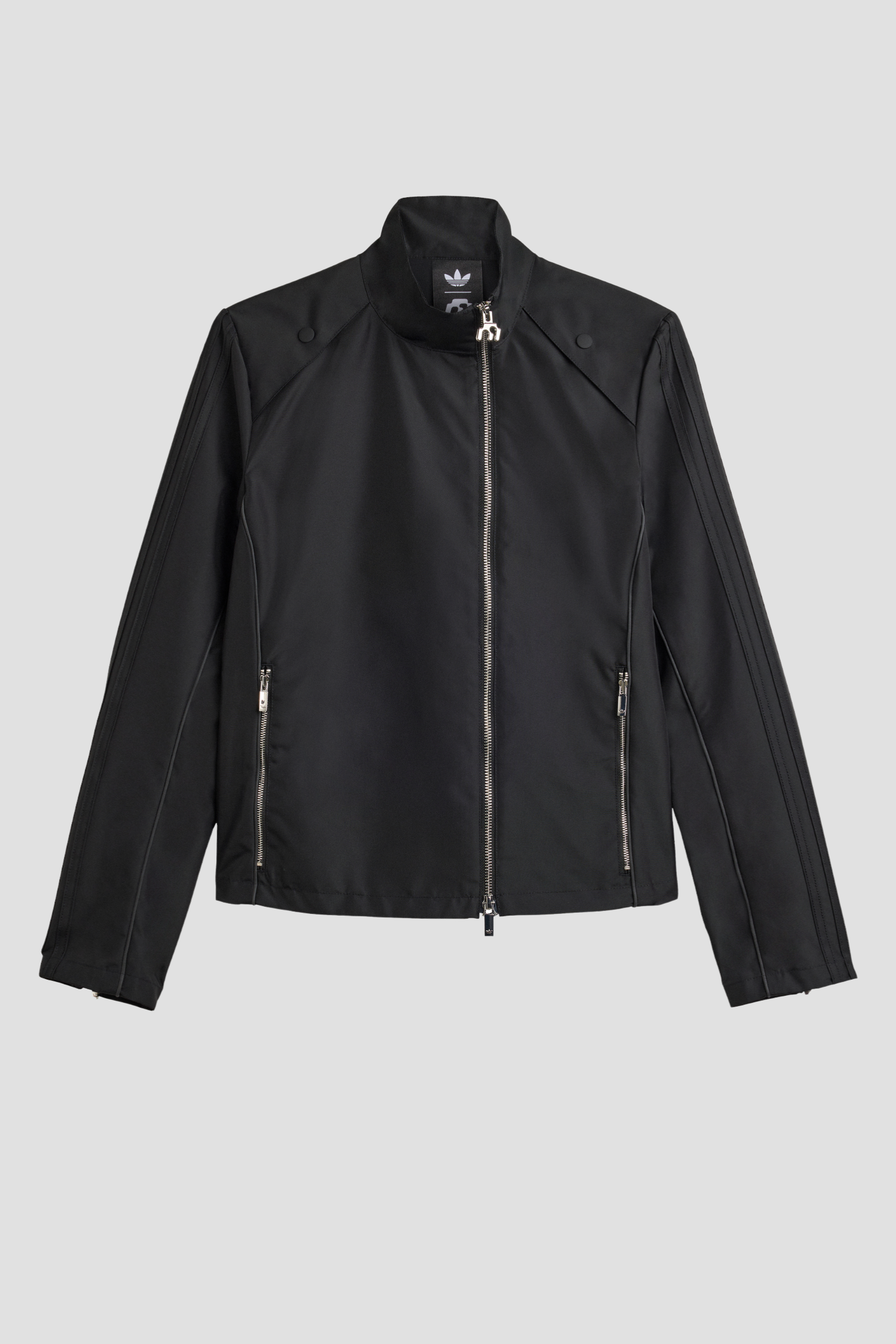 Black motorcycle-inspired jacket with an asymmetric two way zipper. Designed in a slim fit, the tracktop is made to hug your body, offering a sleek silhouette that moves with you. The canvas construction provides durability, making it a staple piece for your wardrobe that you will come back to, season after season.