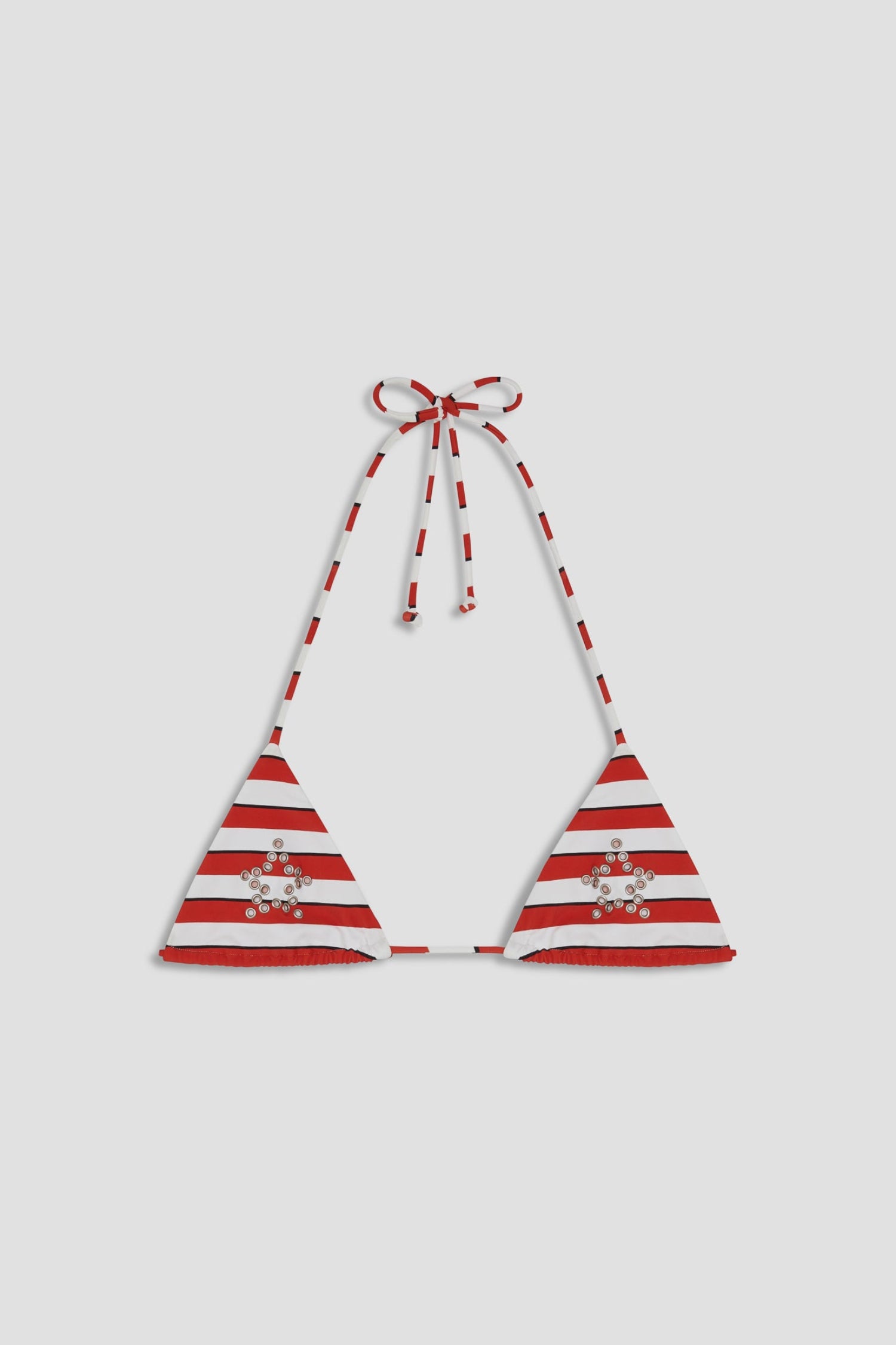 The Kauai Top - now in red stripe. She's a stringy triangle bikini in with grommet detailing that can be tied many ways for a perfect fit. Size up for more coverage.