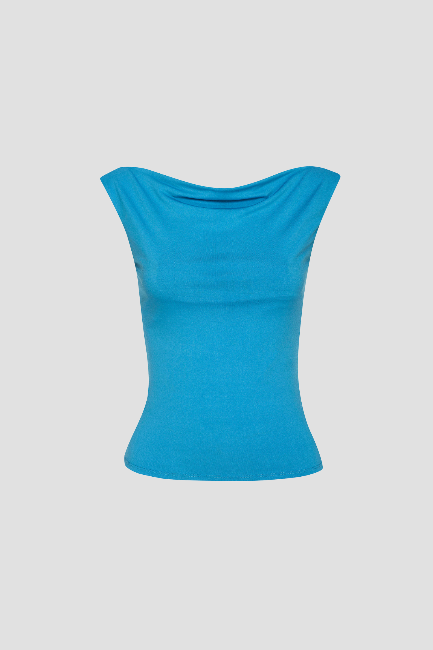 Meet the Lani in Cerulean. With her cinched waist and cowl neckline, this sleeveless tank complements your body perfectly.