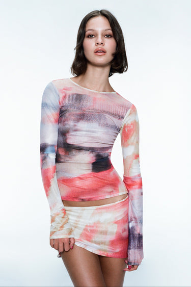 Our bestselling Long Sleeve Tee is back in sculpting mesh. Featuring perfect long sleeves, a new blurred flare print, and ultra soft fabric - it's no wonder she's always sold out. Slip her on with the matching Elektra Skirt or the tan Element Pant.